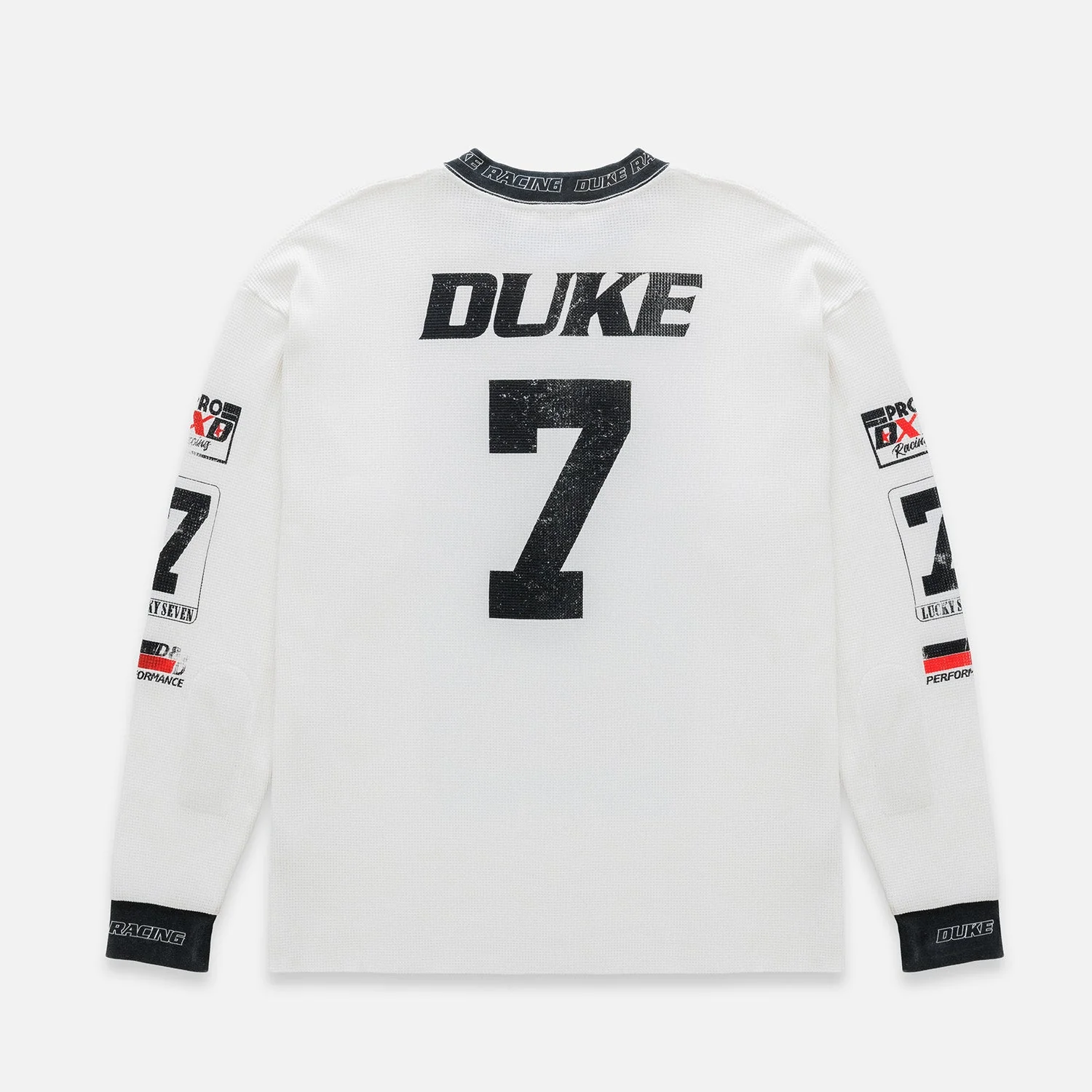Our DR Motocross Top is modelled on an undershirt from the 1990s. Knitted in a waffle stitch, it’s made from midweight 390gsm cotton and has faded, water-based graphics across the back, chest and sleeves. The ribbed trims are lifted from vintage styles, with printed Duke Racing spell-outs throughout.
