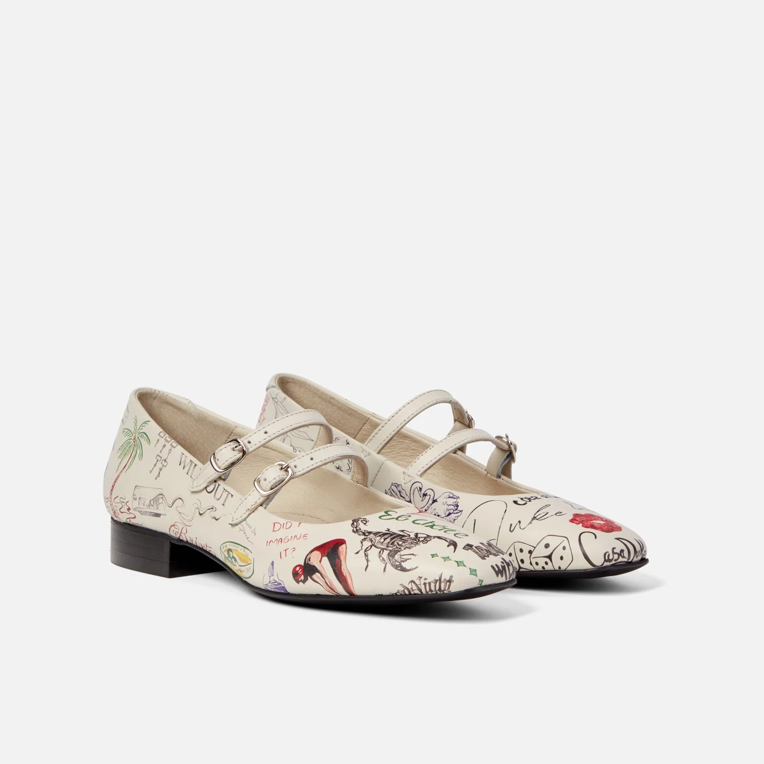 These custom illustrations appear throughout the Ruby Sketch Mary Janes, individually placed across the uppers by our team in Brixton. Theyâre made from off-white leather and have a pair of straps across the top.